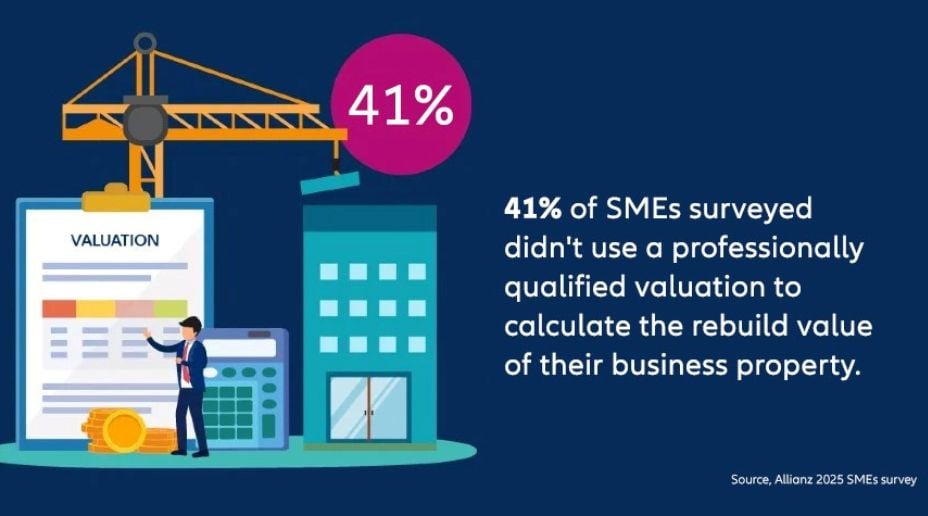 It is also important to make sure that your customers sums insured for buildings is based on the cost of rebuilding the property and not the market value. This may include cost of materials, labour costs, professional fees and site clearance. A recent Allianz survey* showed that 41% of SMEs didn’t use a professionally qualified valuation to calculate the rebuild value of their business property.